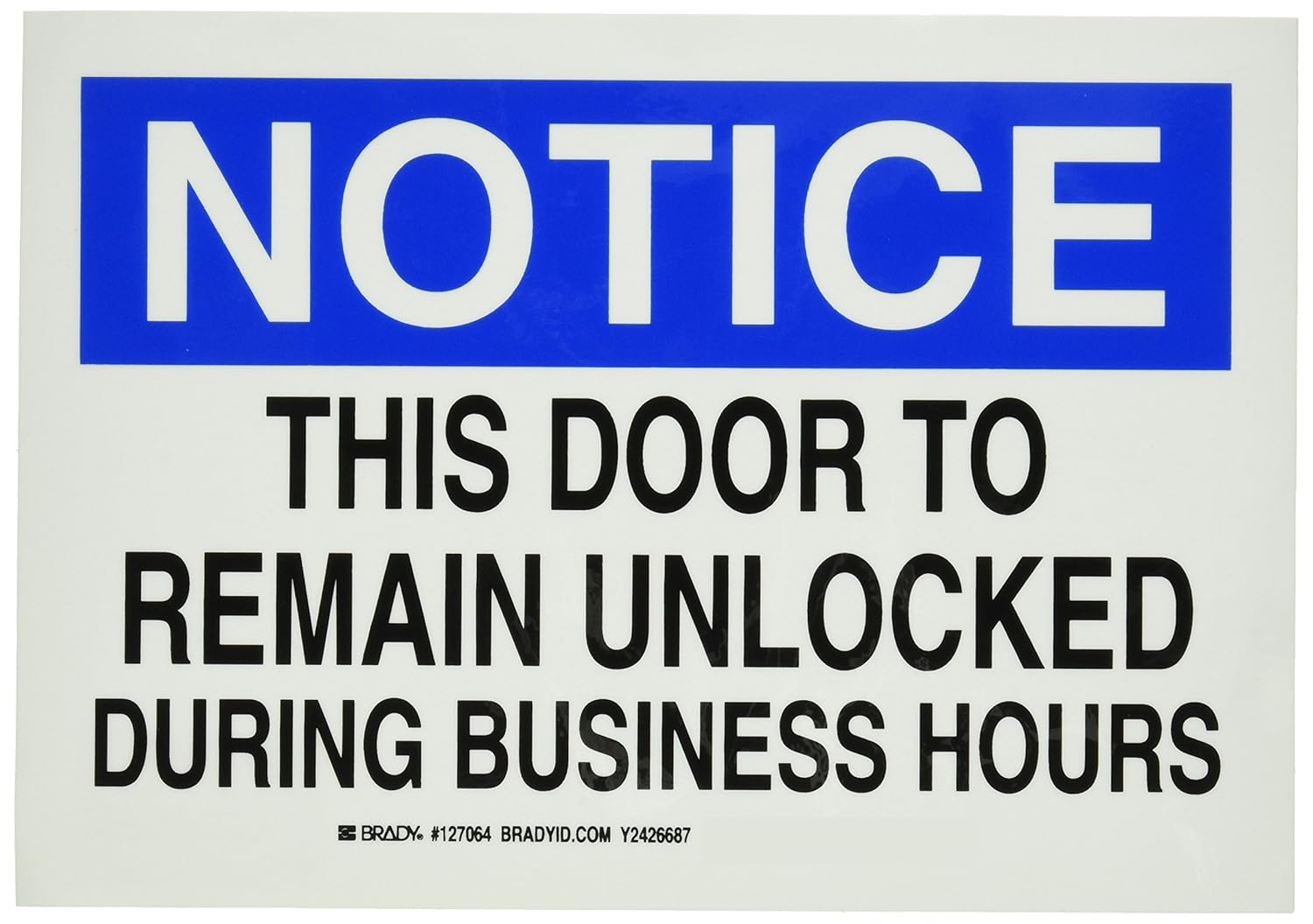 The vinyl is waterproof, will apply bubble free, and will last 10+ years indoors, . This door to remain unlocked during business hours safety sign madm564. Swinging doors and gates can cause all kinds of problems. Available in either white on black vinyl. Door to remain unlocked signs reminds everyone in your facility to follow established procedures whether the message is for safety, customer flow or other .